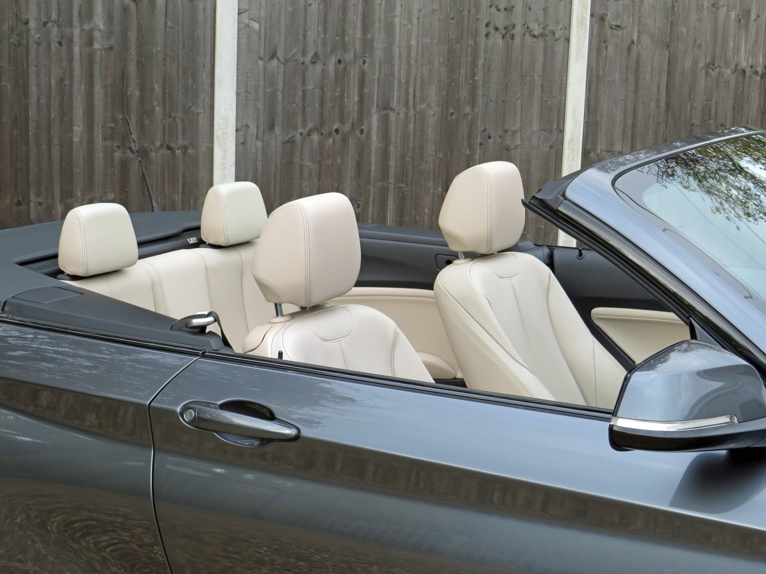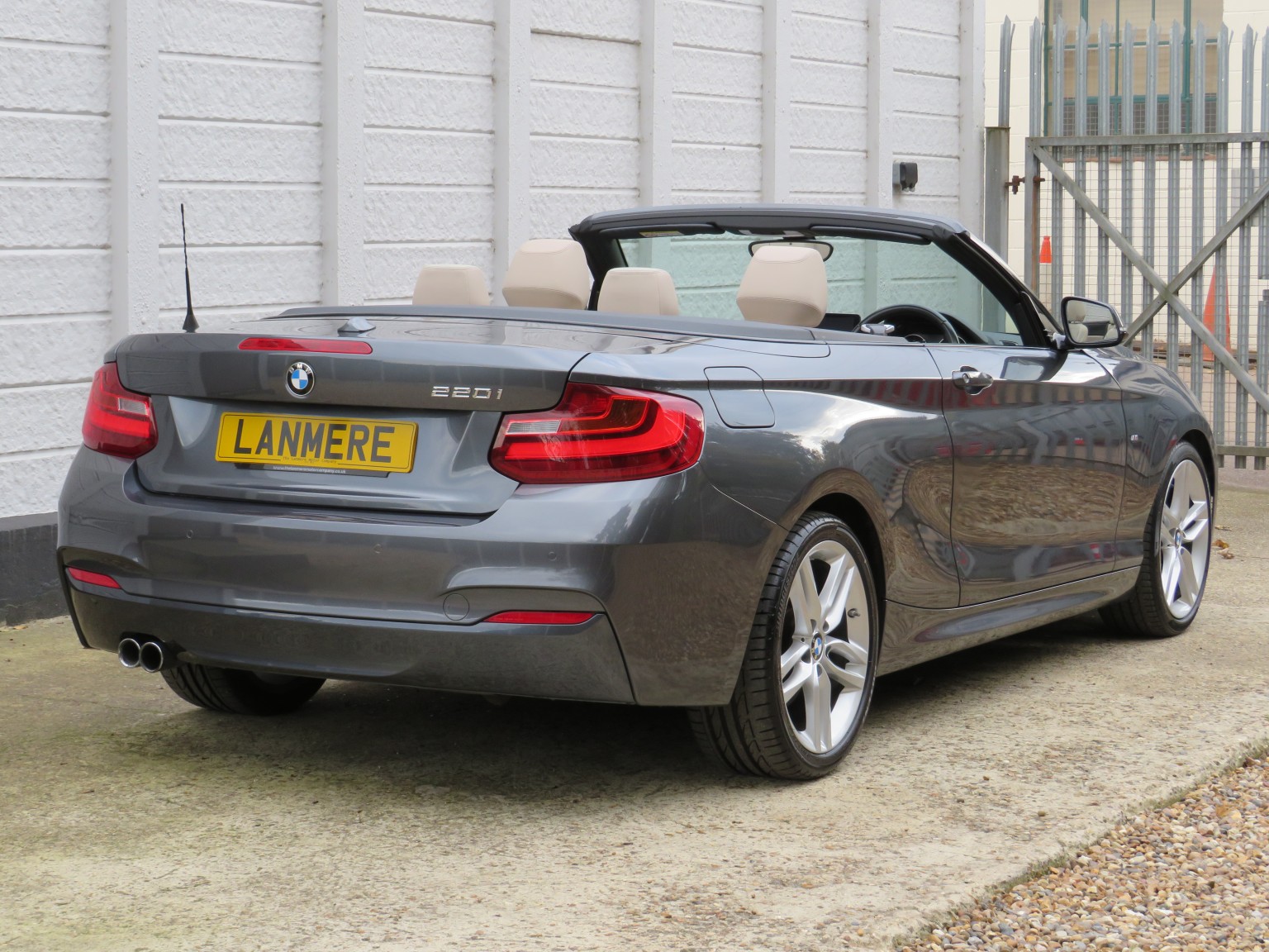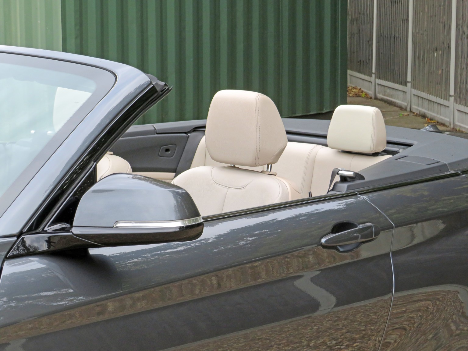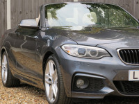 January 2017 66 reg BMW 2 Series 220i M Sport petrol Cabriolet Automatic finished in a stunning colour combination of Mineral Grey metallic with Oyster Dakota full leather upholstery.