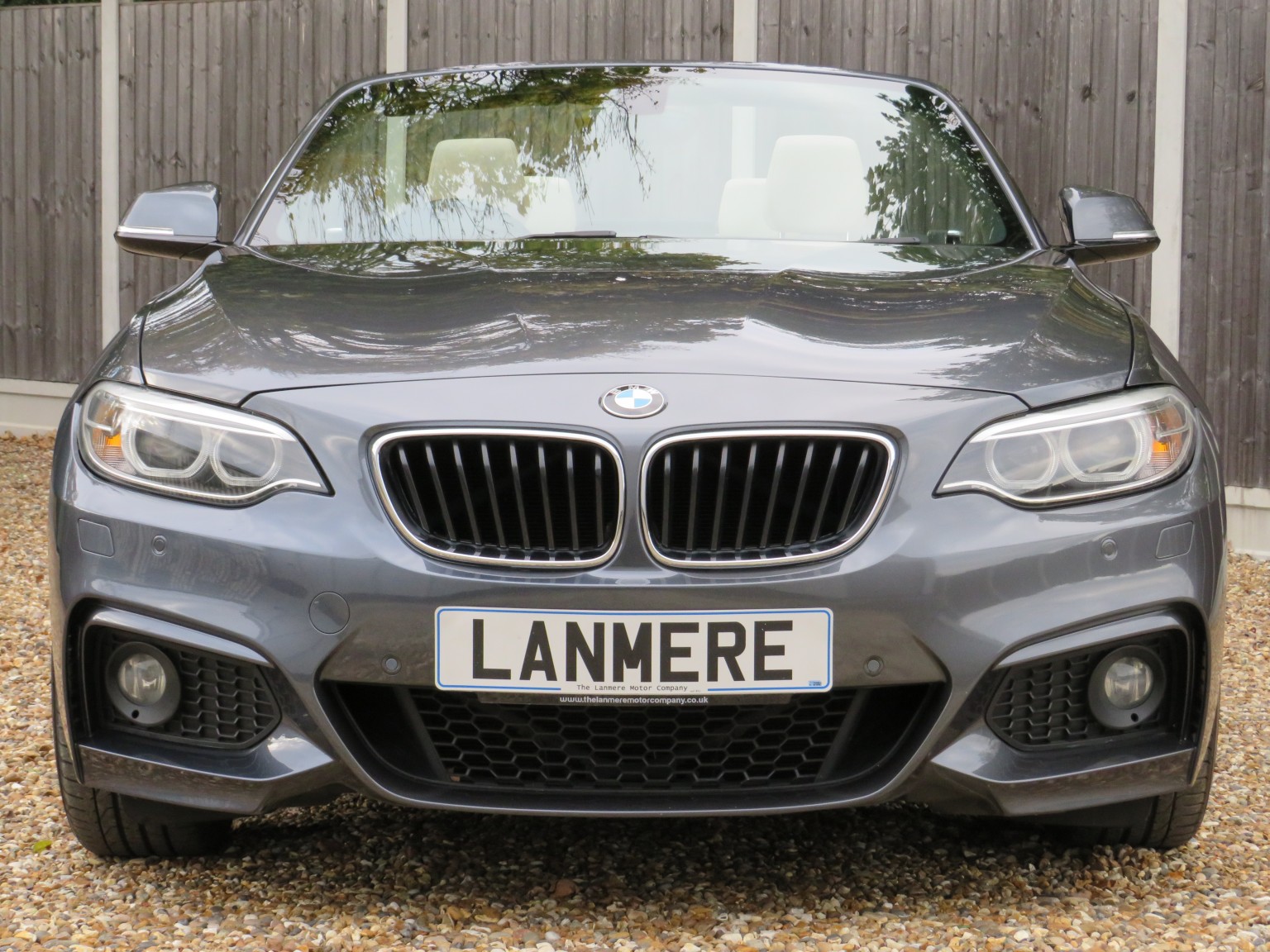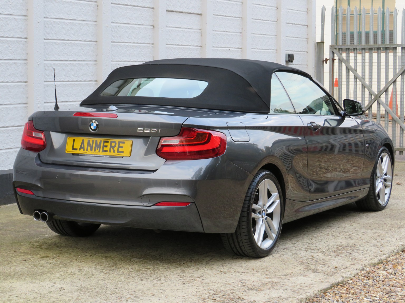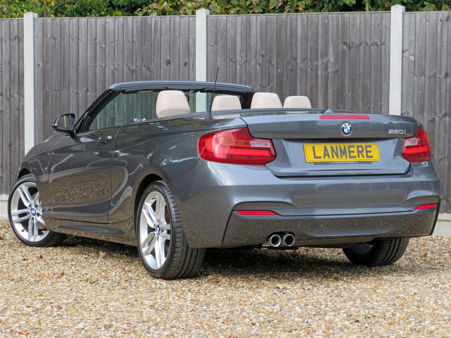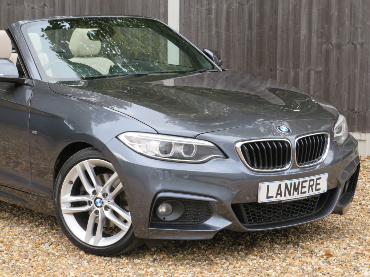 January 2017 66 reg BMW 2 Series 220i M Sport petrol Cabriolet Automatic finished in a stunning colour combination of Mineral Grey metallic with Oyster Dakota full leather upholstery.