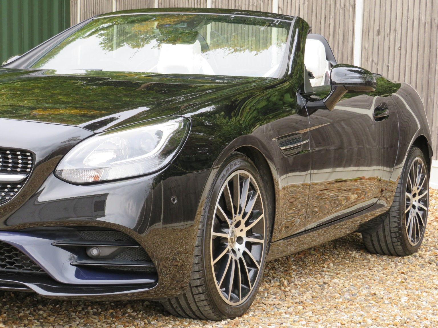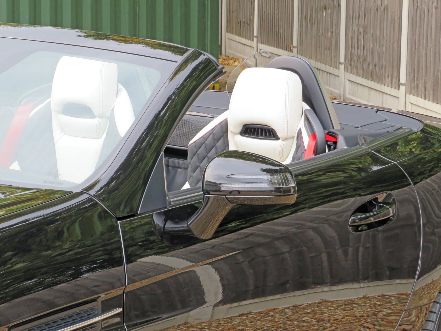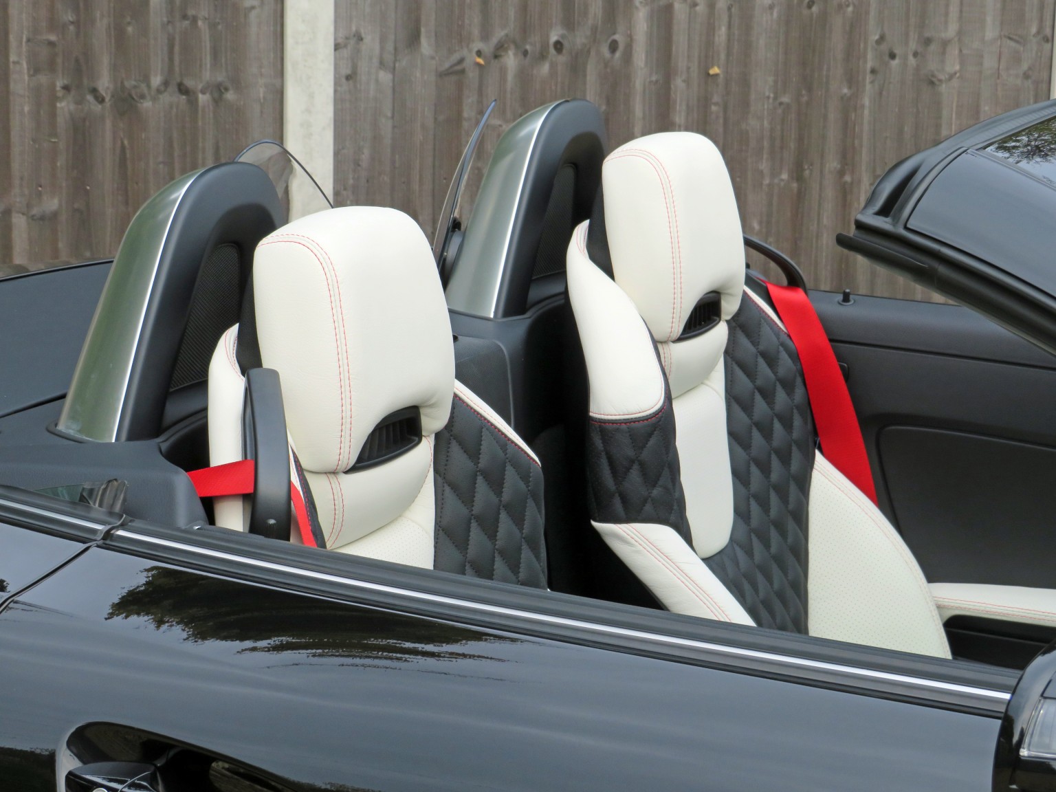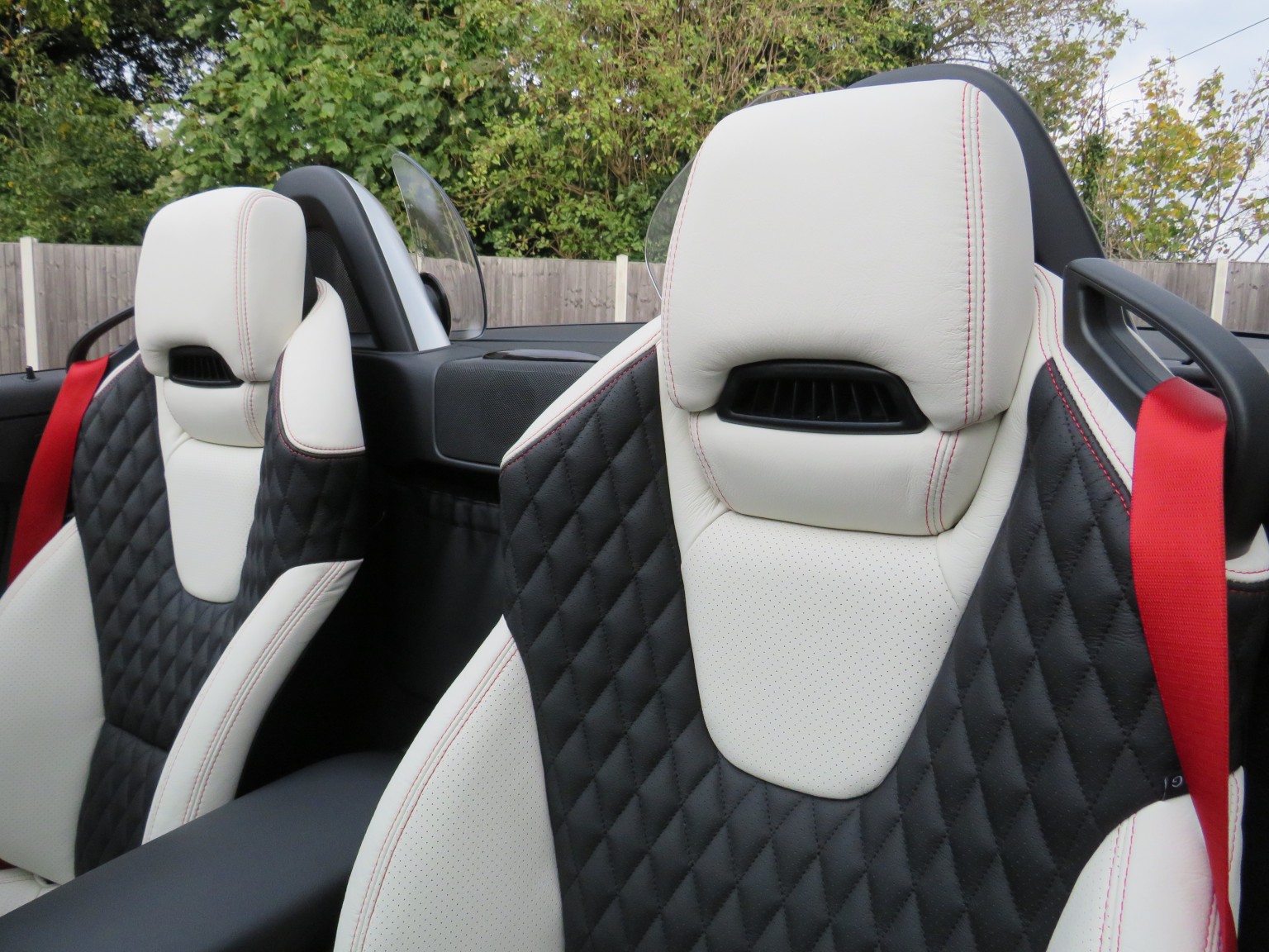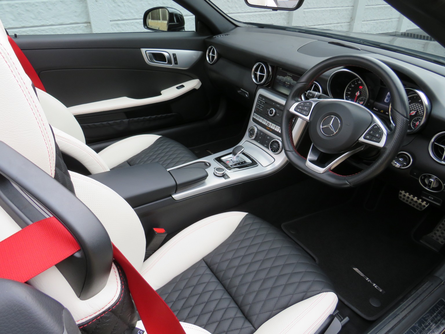 Specification includes AMG Night Package, Exclusive two tone black and white quilted and perforated bespoke leather upholstery with detailed red stitching. Airscarf neck level heating, front and rear Parktronic parking guidance, heated seats, rain sensor, cup holder, Air Guide (glass wind deflectors), aluminium roll bars, SD Satellite Navigation preparation, nine speed automatic gearbox, AMG Line Styling Package, AMG Sport Package, 18 inch AMG multi spoke alloy wheels, auto lights, cruise control, Bluetooth telephone, Bluetooth audio plus much much more!